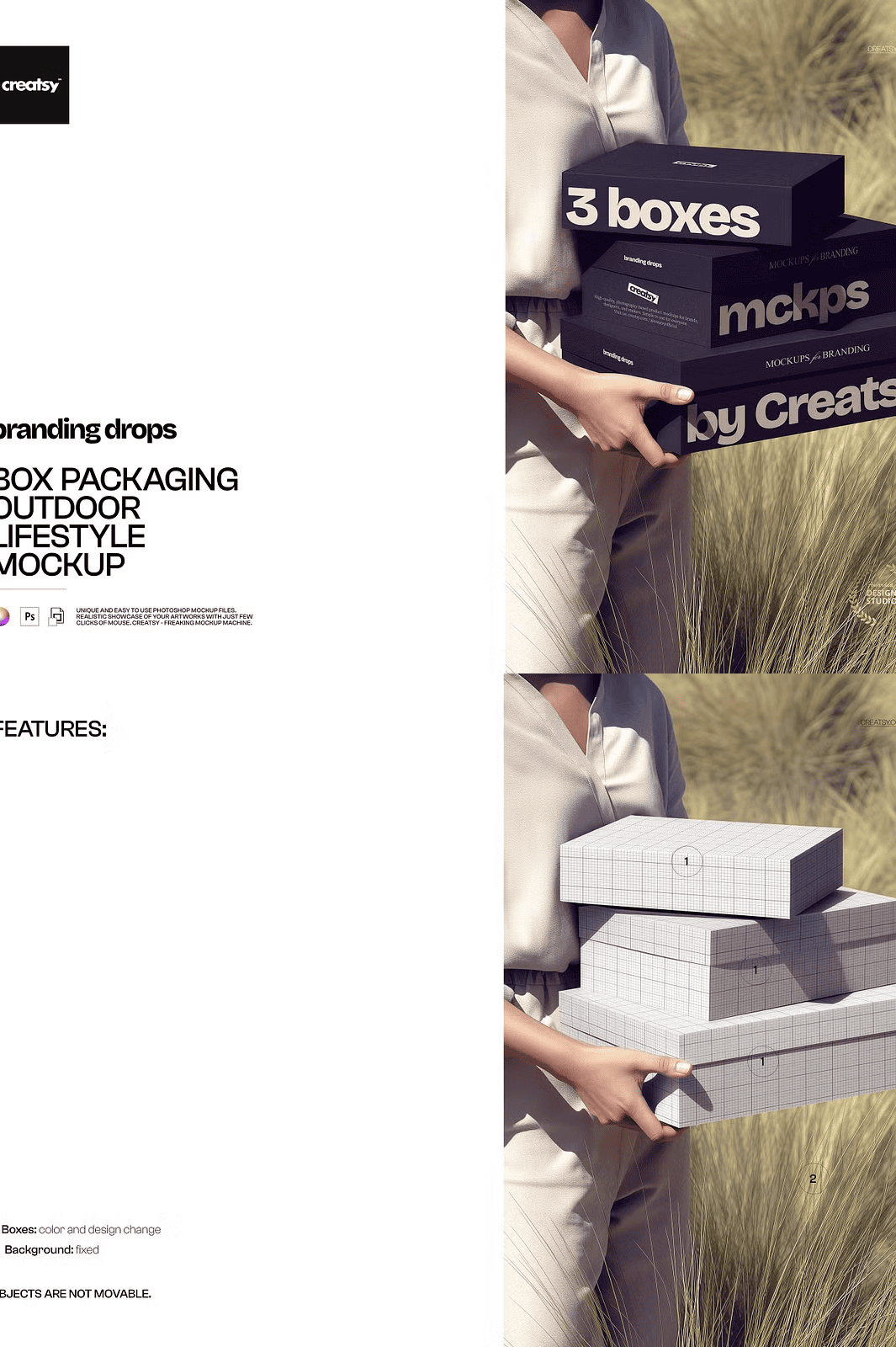 - Seamless Layer Organization: Features clearly tagged and structured layers for easy editing: background, ground, shadow, box placement, lighting, and content area. Replace your design in seconds with one-click adjustments and perfect alignment.