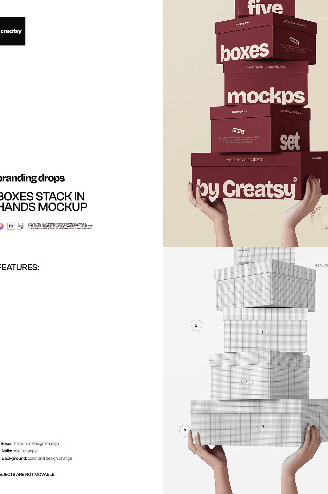 - Well-Organized & Fully Editable Layers: Designed with clarity in mind. Layers are clearly labeled (background, hands, shadows, box placement, lighting, and content area), enabling quick and precise edits—replace your design with one click and align perfectly with minimal effort.