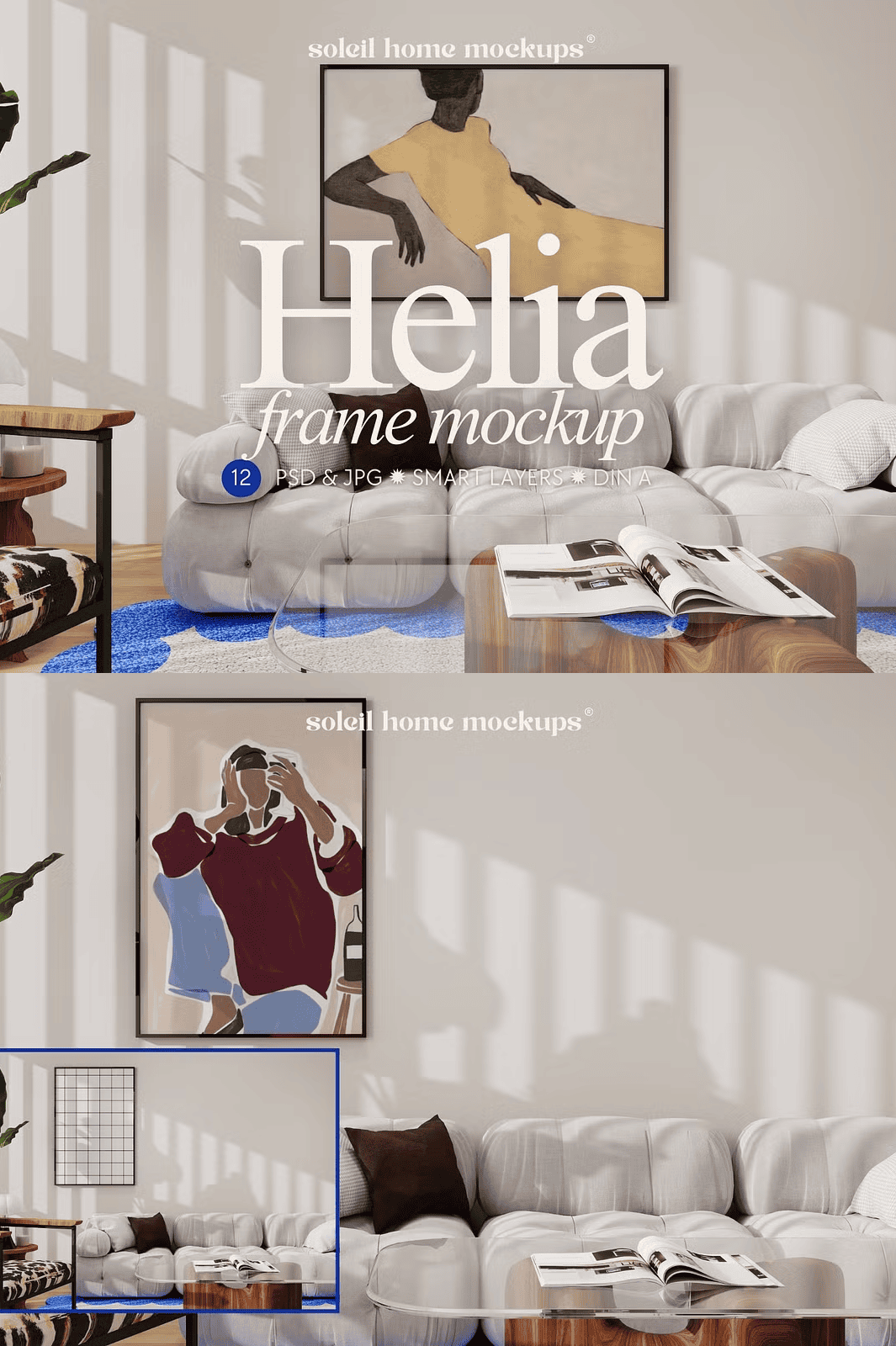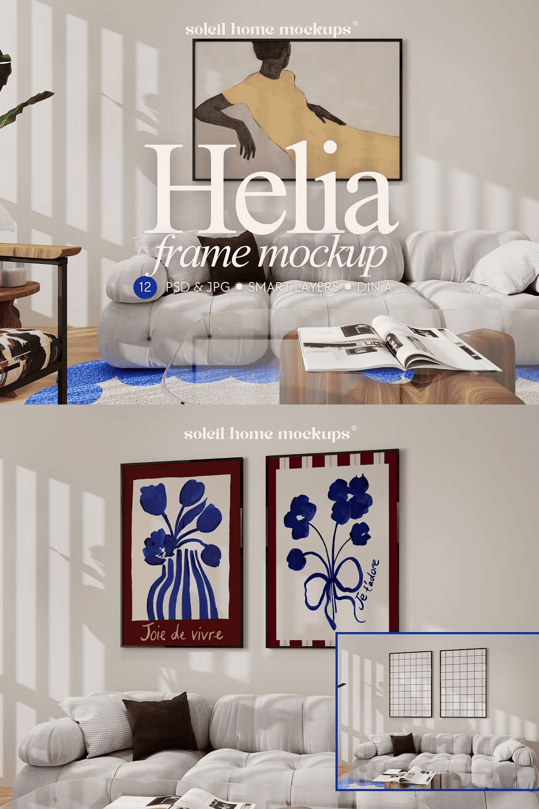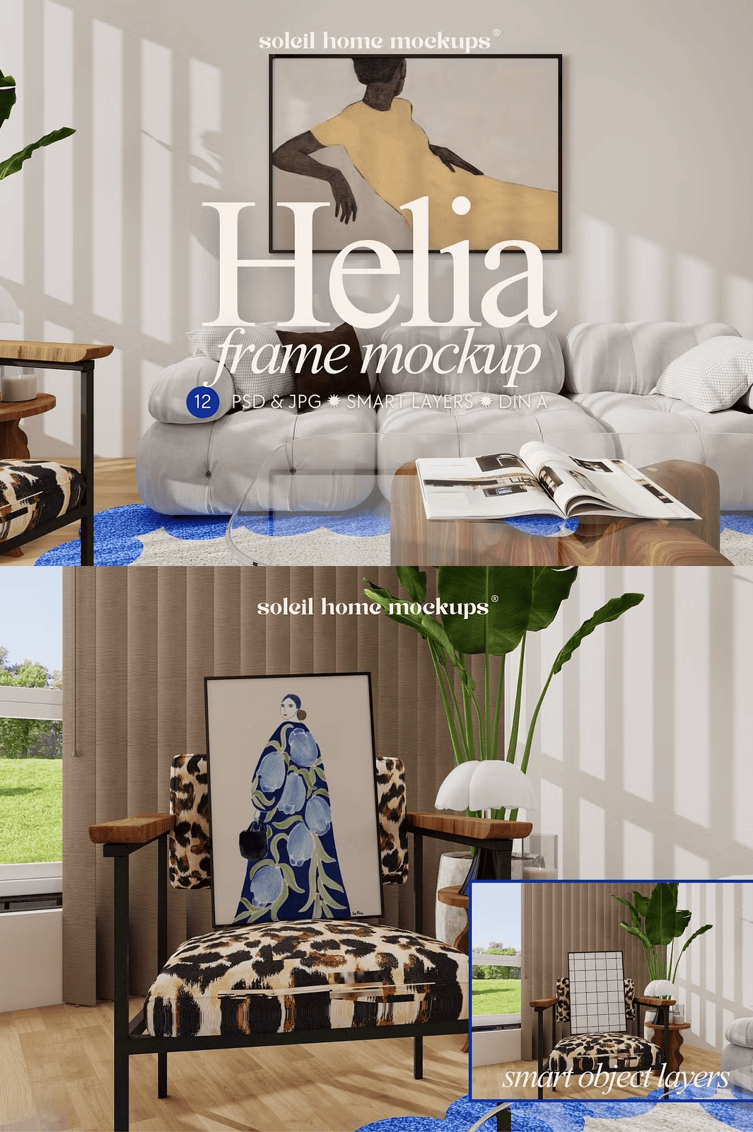 Introducing the **HELIA Collection**—an exclusive bundle of 12 premium frame mockups set in a vibrant, contemporary living room environment. This meticulously crafted 3D-rendered scene features a sleek white sofa, a bold blue carpet, and a luxurious cheetah print accent, creating a visually dynamic backdrop that showcases your artwork with elegance and modern flair. Whether you’re selling posters, fine art prints, or digital designs, this collection gives you the professional edge to captivate customers and increase conversions.