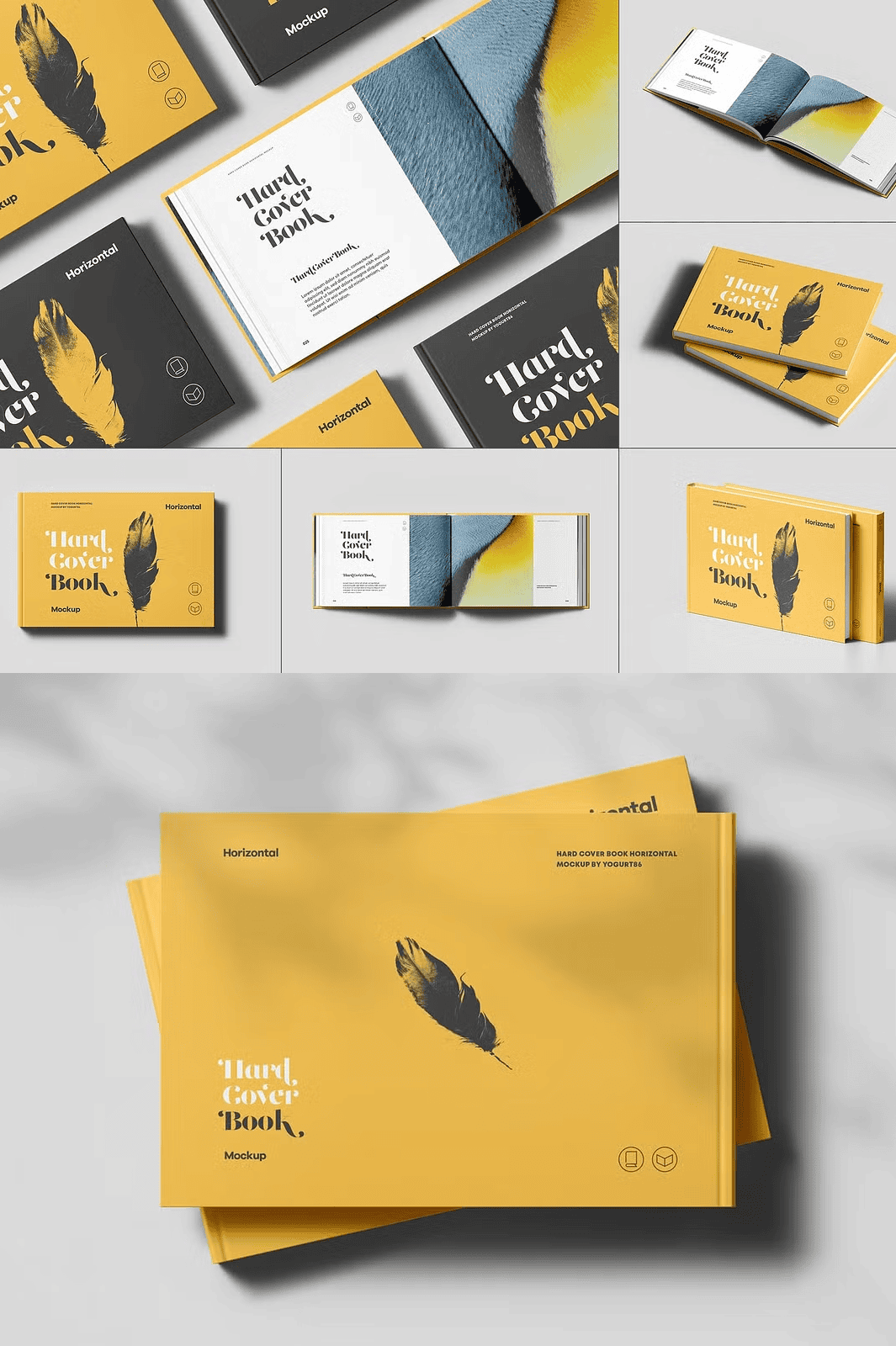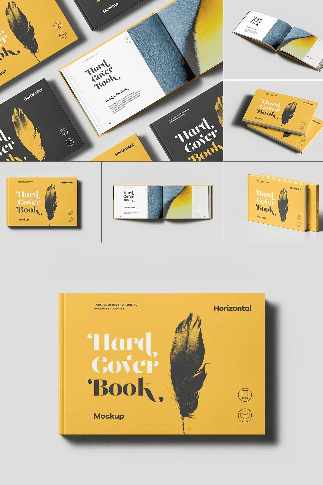 - Hard Cover Book Mockup with Open Pages: Display your book’s spine, cover, and inner pages with realistic paper texture, accurate fold lines, and dynamic lighting for a premium print aesthetic.