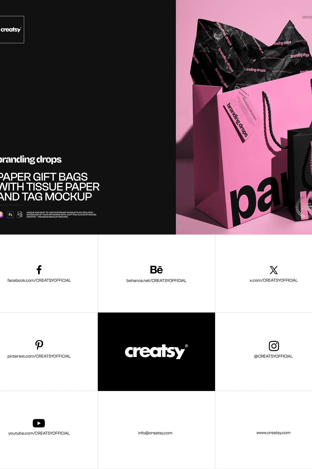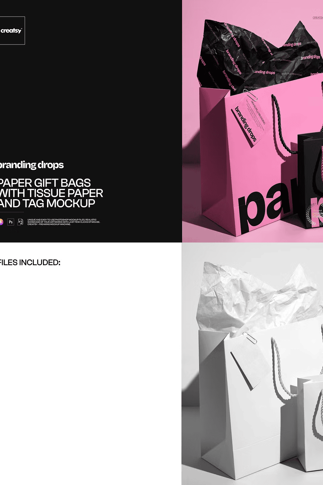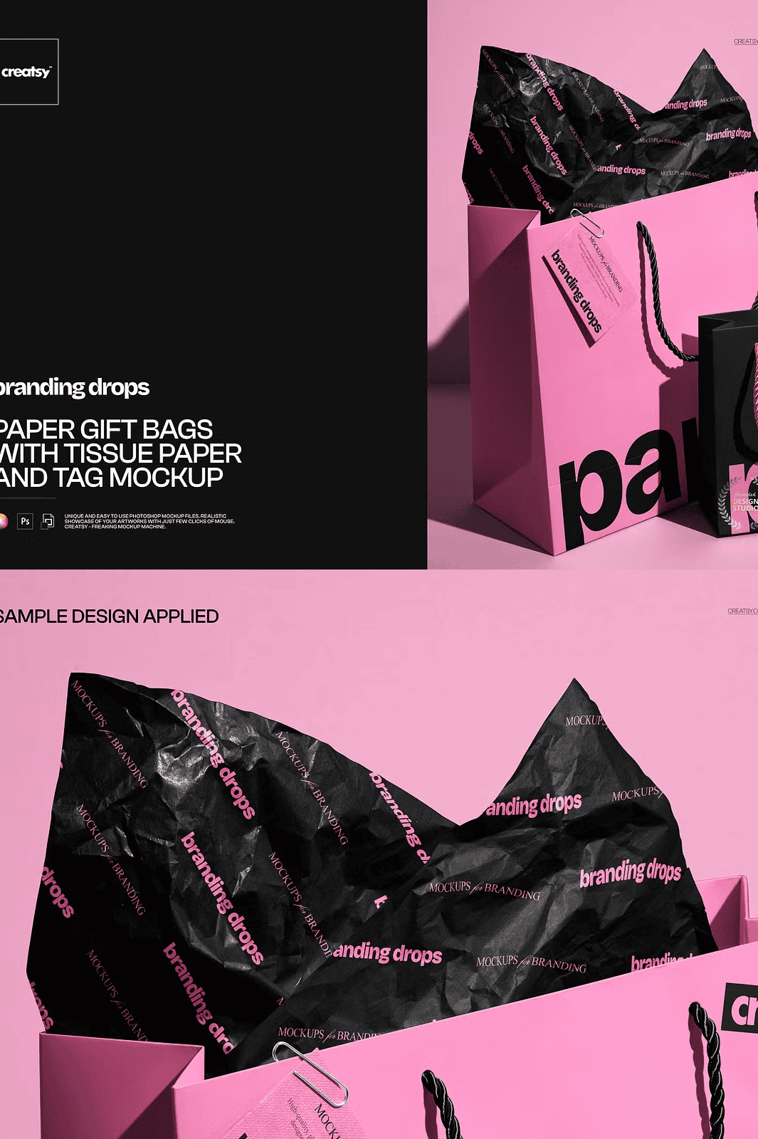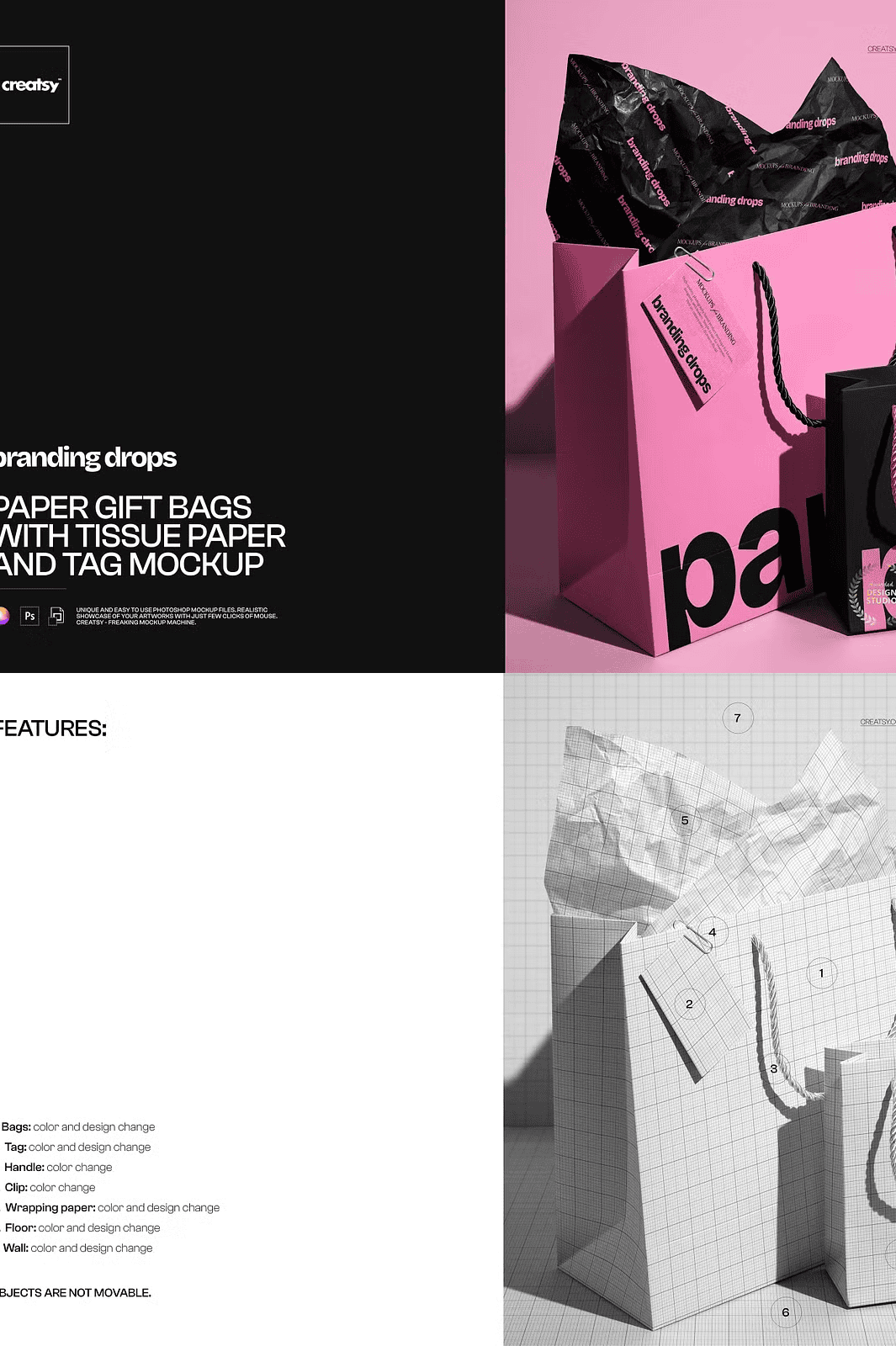 Effortlessly insert your own product image or design using the clearly labeled smart object layer. Simply open the PSD file in Adobe Photoshop (version CC2020 or later) or in the free browser-based Photopea platform, double-click the layer, and place your artwork. The mockup adjusts automatically to maintain perfect proportions, sharp clarity, and authentic lighting. With well-organized layers, every element—tissue folds, tag positioning, shadow depth, and wrapping folds—is meticulously separated, so you can fine-tune individual components without risk of disruption. This non-destructive editing workflow ensures flexibility, speed, and precision, making it ideal for fast-paced creative teams and solo designers alike.