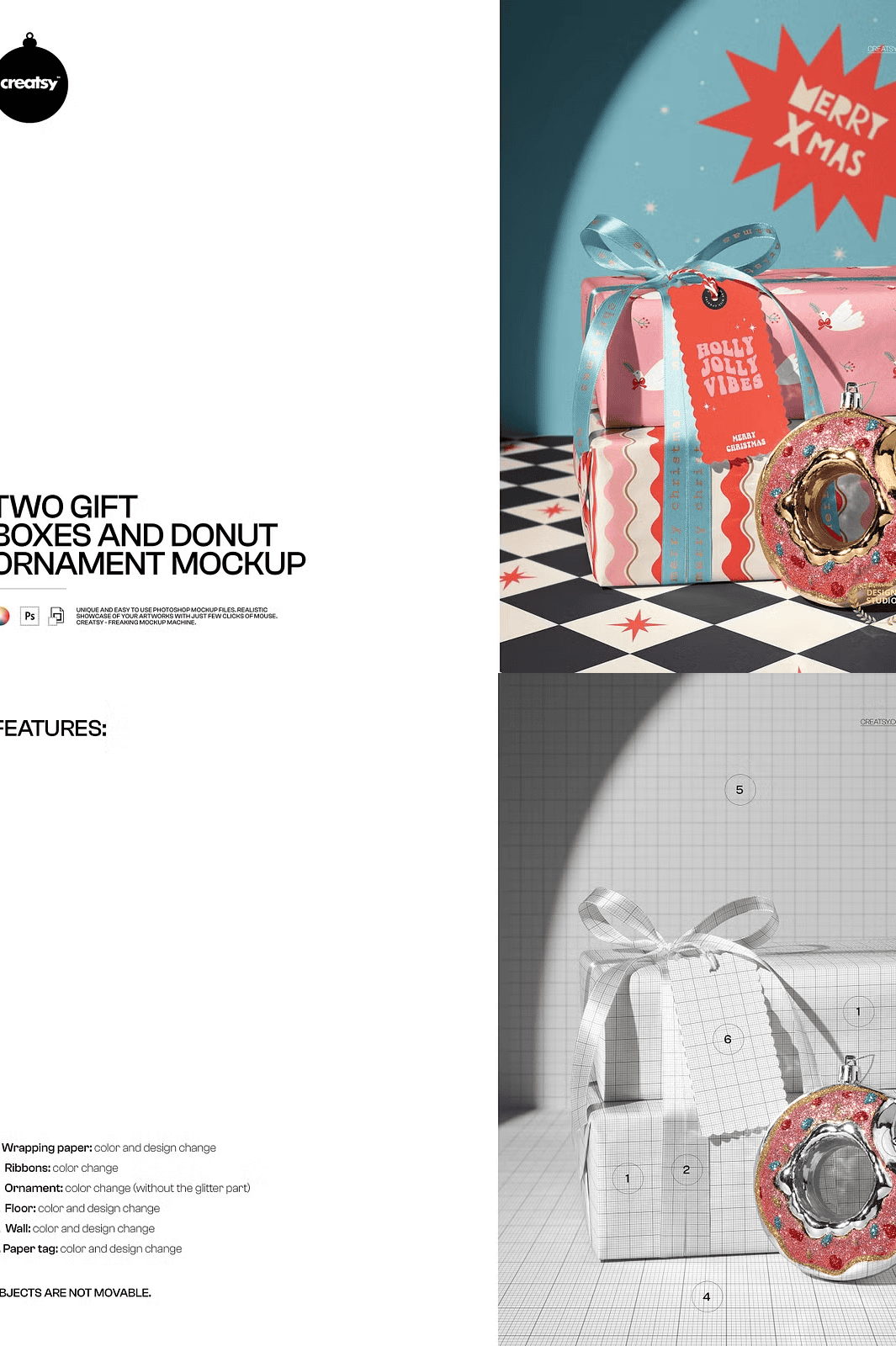Engineered for print, web, and digital campaigns, this mockup delivers exceptional clarity with a **6000x4000px resolution** and **300dpi precision**. Every fiber of wrapping paper, every crease in the ribbon, and each delicate crackle in the wooden table surface is rendered with photographic accuracy. The Smart Object layer for the donut ornament ensures crisp, non-destructive editing—swap in your own design, brand logo, or seasonal message without sacrificing quality. Whether you’re presenting a luxury gift line, a limited-edition holiday collection, or a digital greeting card, the level of realism ensures your creation feels tangible, credible, and unforgettable.