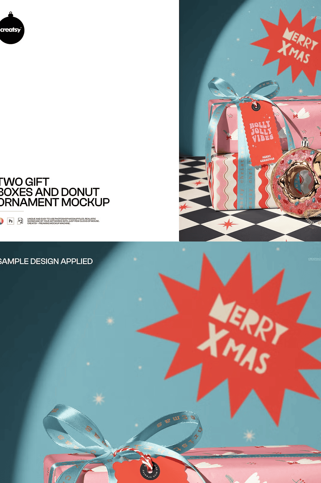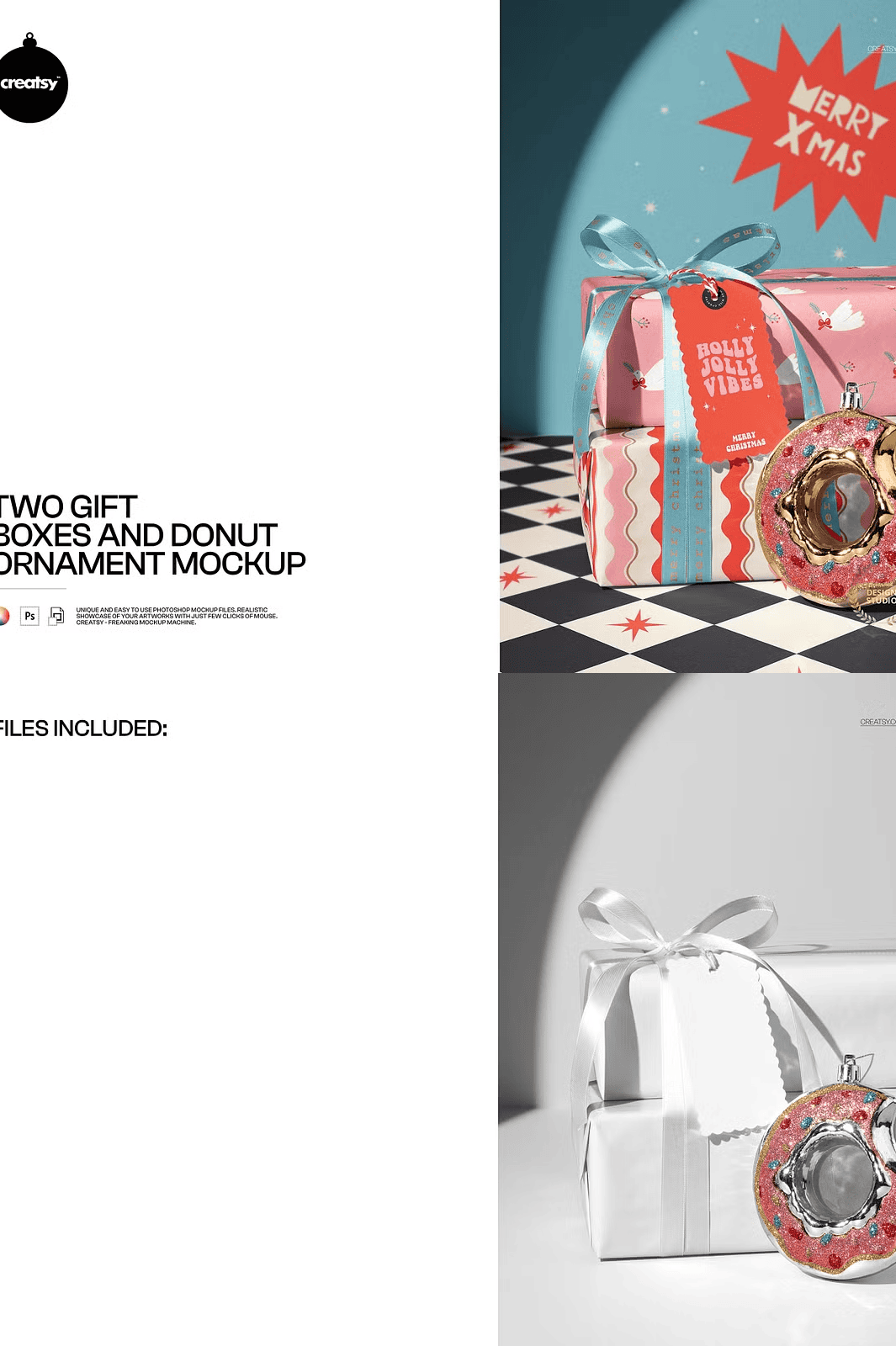 Transform your seasonal designs into captivating stories with this **Two Gift Boxes and Donut Ornament Mockup**, meticulously crafted to mirror a real-world holiday table setting. The scene features two beautifully wrapped gift boxes—each with distinct wrapping patterns, ribbons, and bows—paired with a whimsical donut ornament hanging from a festive string, all placed on a warm-toned wooden surface. Natural light cascades across the composition, casting soft shadows and highlighting subtle textures in the paper, fabric, and wood grain. The result? A deeply immersive environment that blends charm, elegance, and seasonal warmth—perfect for holiday cards, gift packaging designs, promotional flyers, or festive Instagram posts.