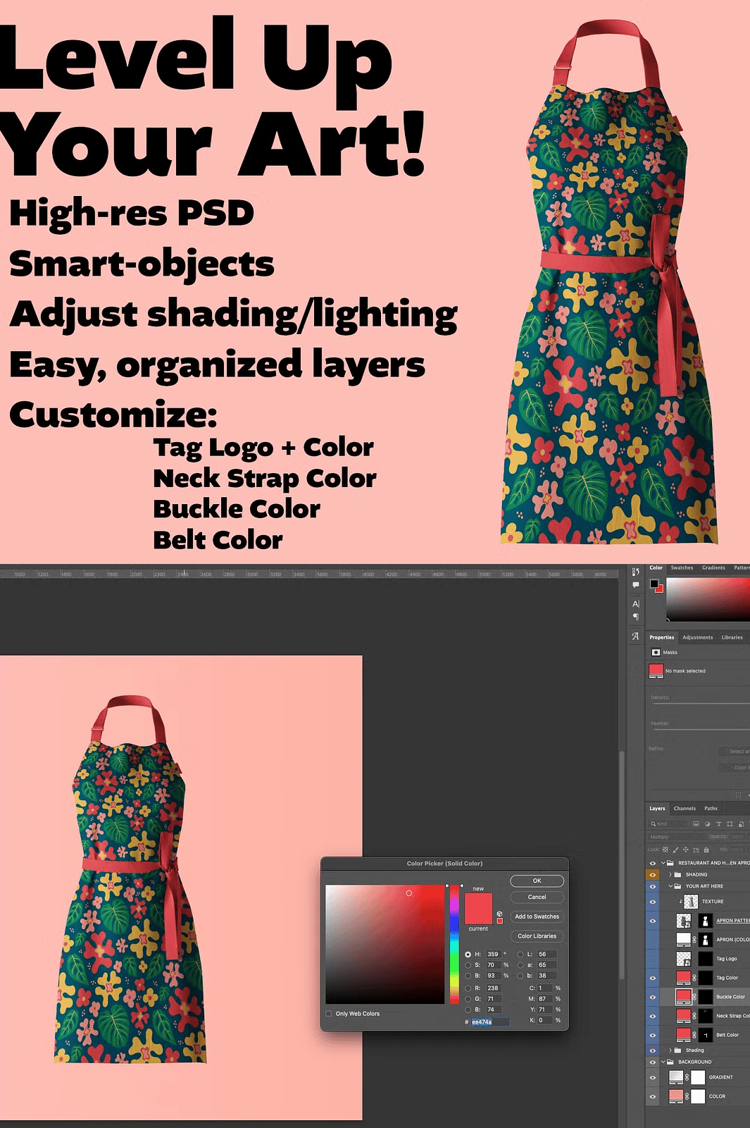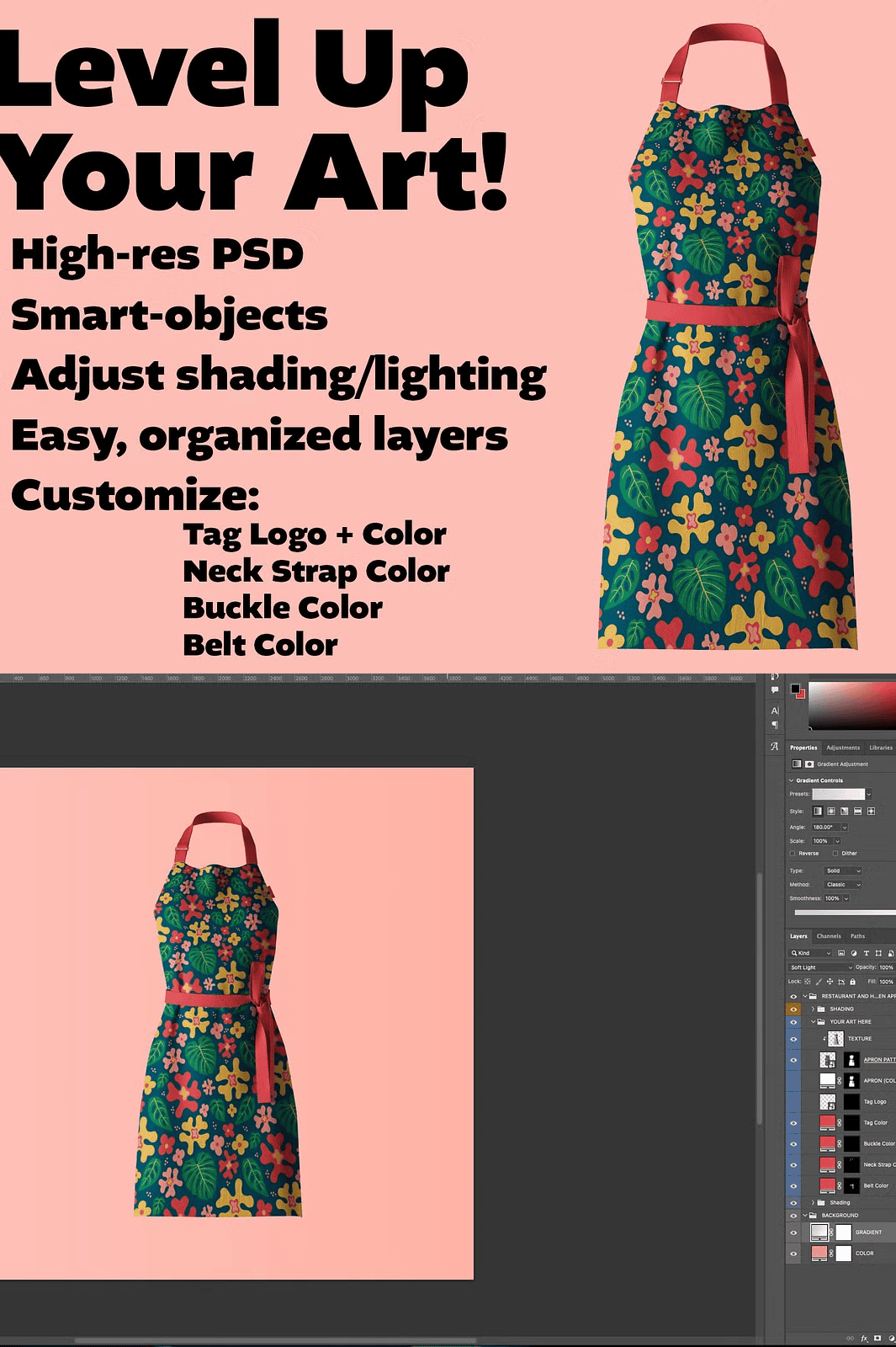 Take full ownership of your design look. Easily change the apron color, neck strap hue, buckle shade, and belt tone using non-destructive adjustment layers and fill layers. The design is built to be modular—swap out the main textile layer with your own pattern or artwork in seconds. Additionally, export your finalized mockup as a transparent PNG to place the apron on any background—ideal for website banners, social media posts, and digital catalogs. This level of flexibility ensures your designs shine across all platforms and use cases.