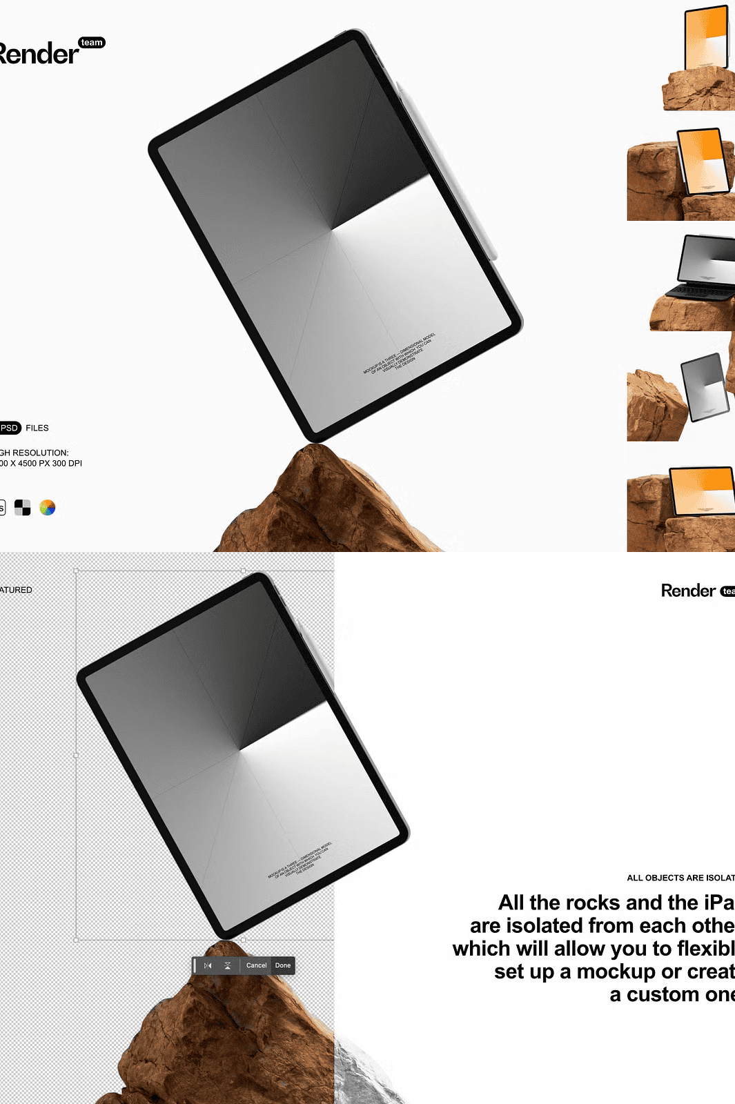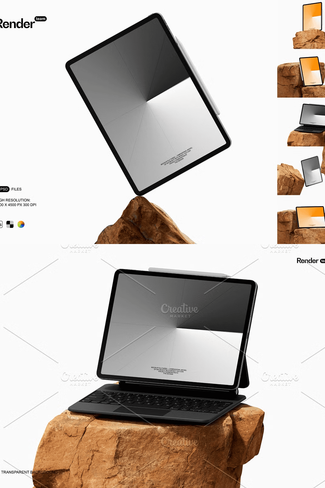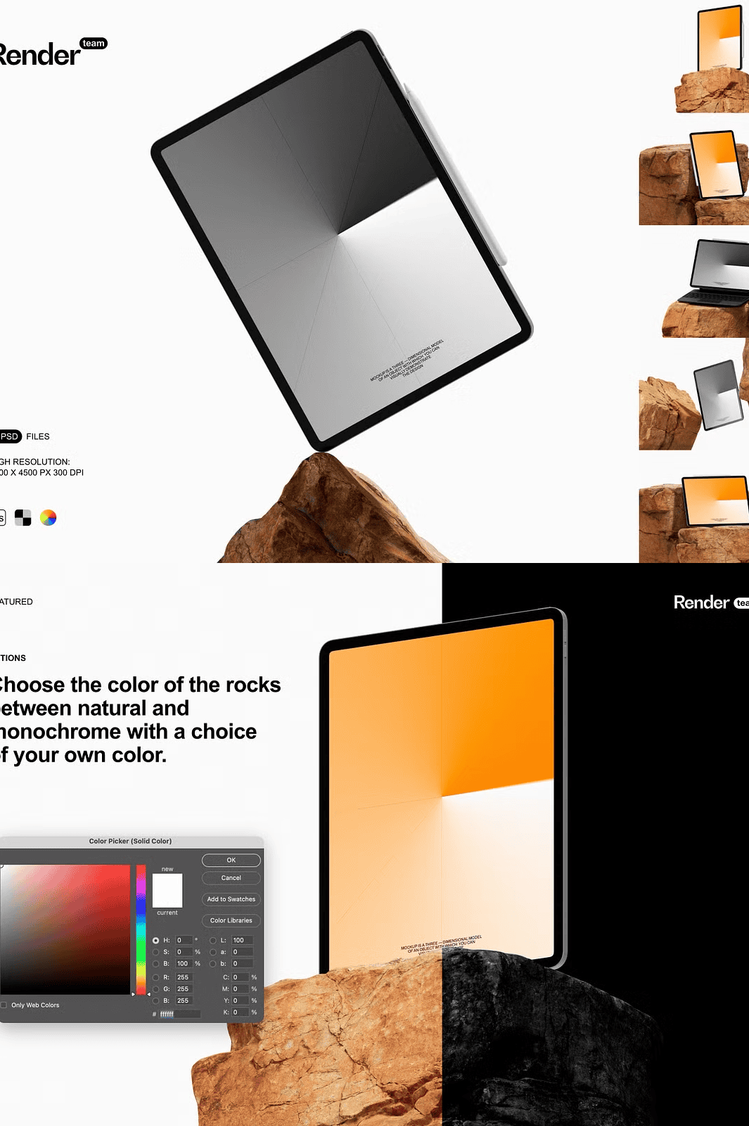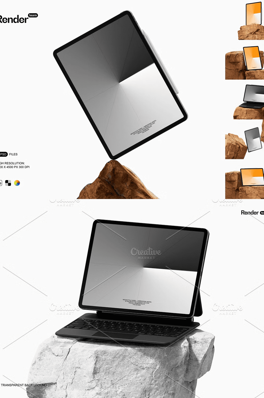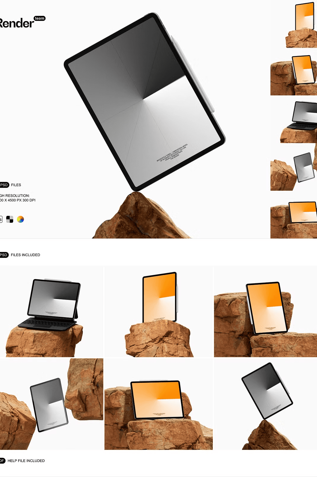 The mockups are crafted to feel real — with natural, textured rock backgrounds that add depth and authenticity. Whether your design is viewed on a coffee table, in a hand-held scenario, or on a minimalist workspace, the realism brings your project to life. Create unique scenes that tell a story — not just show a screen.