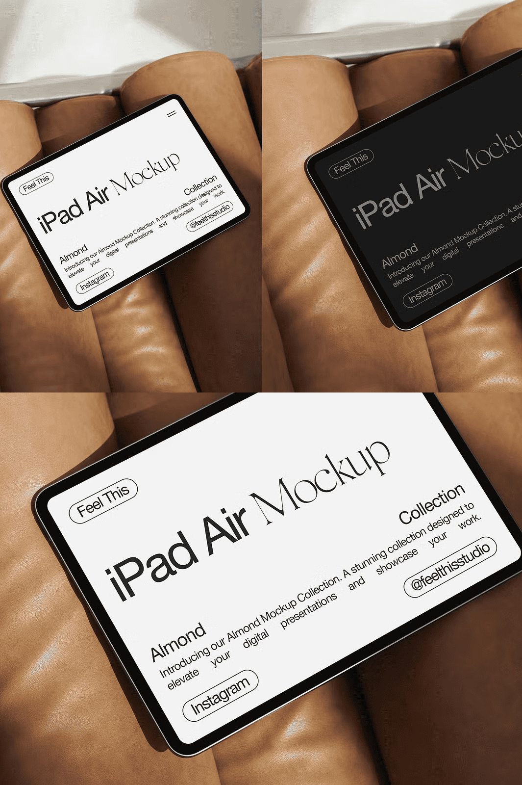This iPad Air on Brown Chair mockup is one of 17 premium assets in the *Almond Mockup Collection*, available for just $35. Don’t miss this incredible opportunity to access a wide variety of high-quality templates at a fraction of the cost of buying them individually. Elevate your entire design toolkit today — visit feelthis.co/almond-bundle to secure your bundle now.